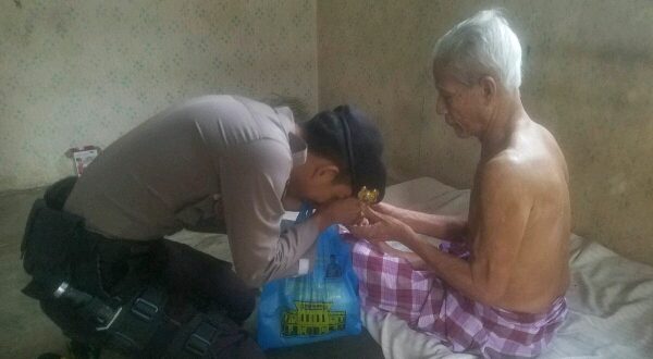 LHOKSEUMAWE- Kakek Abudullah penderita stoke dan lumpuh warga Desa Lancok mendadak disambangi sejumlah polisi yang patroli sambil berbagi sembako dalam program polisi berberbagi sembako kepada Fakir miskin dan Dhuafa di Wilayah hukum Polres Lhokseumawe. ” Jum’at siang (23/02/2018)