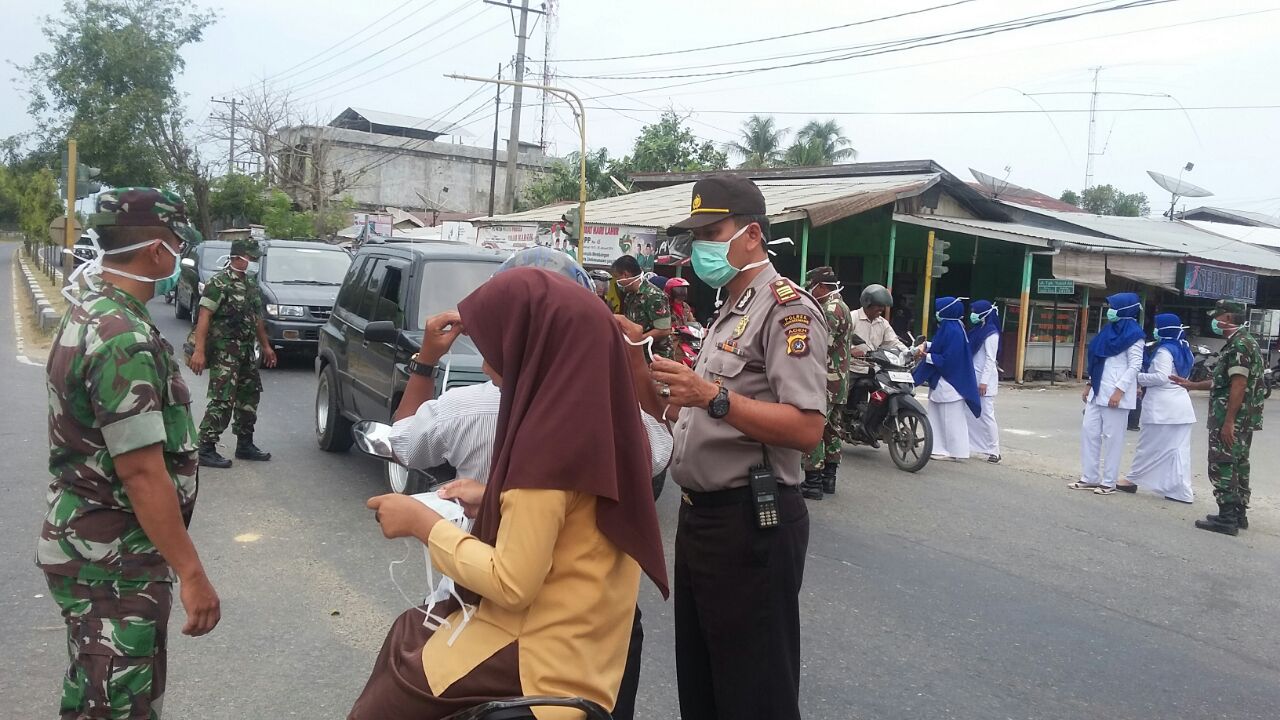 LHOKSEUMAWE- Kali ini Polisi dan TNI bersama petugas kesehatan berbagi masker kepada masyarakat pengguna jalan di Jalan Medan-B.aceh Sp.Rancong kec.muara satu Kota Lhokseumawe.” rabu (21/02/2018) sekira pukul 10.50 Wib