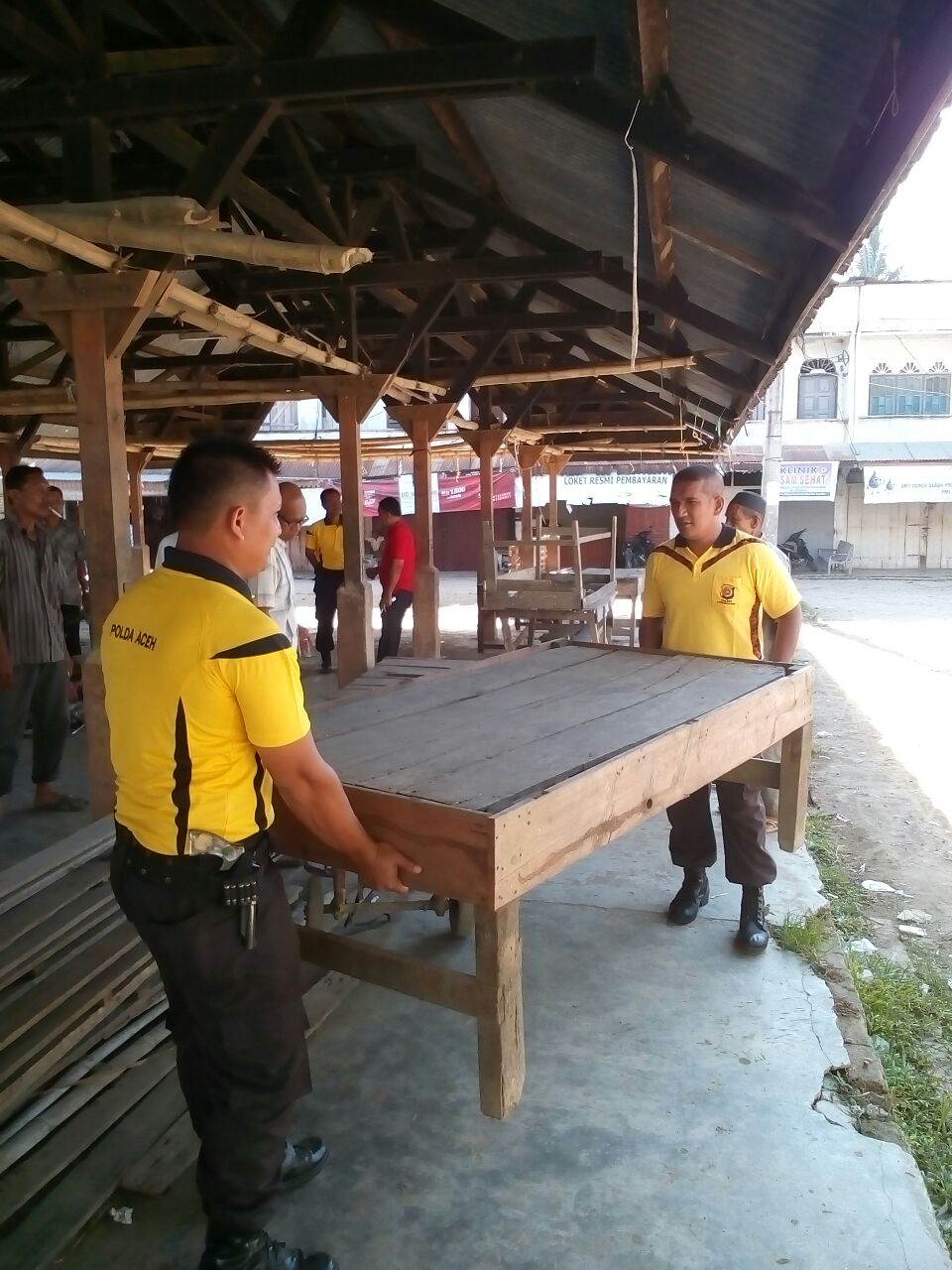 LHOKSEUMAWE- kepolisian Sektor Nisam, bersama unsur Muspika Kecamatan Nisam, Aceh Utara, Minggu (4/2/2018), sekira pukul 9.00 Wib, melaksanakan kegiatan gotong royong bersama dalam rangka menyambut di gelarnya acara doa bersama di Pasar Keude Amplah, Desa Meucat, Kecamatan Nisam, Aceh Utara.
