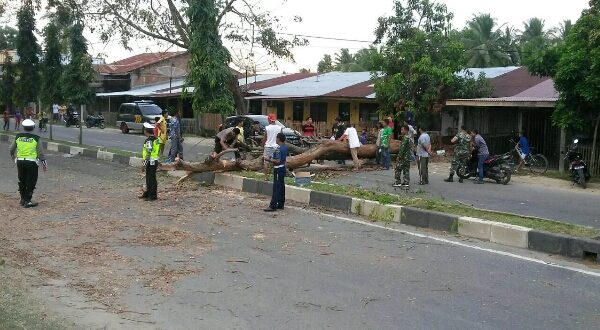 LHOKSEUMAWE- Satu batang pohon Asan berukuran besar tumbang di tengah jalan Medan-Banda Aceh Desa Padang Sakti Kecamatan Muara Satu Kota Lhokseumawe,” selasa (27/02/ 2018) sekira pukul 16.30 Wib
