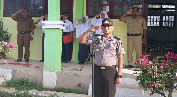 LHOKSEUMAWE- Saweu sikula, Kapolsek Syamtalira Bayu Iptu Hanafiah pimpin upacara bendera di SMP Negeri 1 Desa Bunot Kecamatan Syamtalira Bayu Kabupaten Aceh Utara.”Senin (12/03/2018) sekira pukul 07.30 Wib