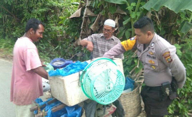 Tribrata News, Lhokseumawe– Brigadir Haikal Bhabinkamtibas Polsek Simpang Kramat menyambangi pedagang ikan keliling saat berpatroli di desa Meunasah Baroeh Kecamatan Simpang Kramat Kabupaten Aceh Utara, kamis (19/04/2018) pukul 10.00 Wib