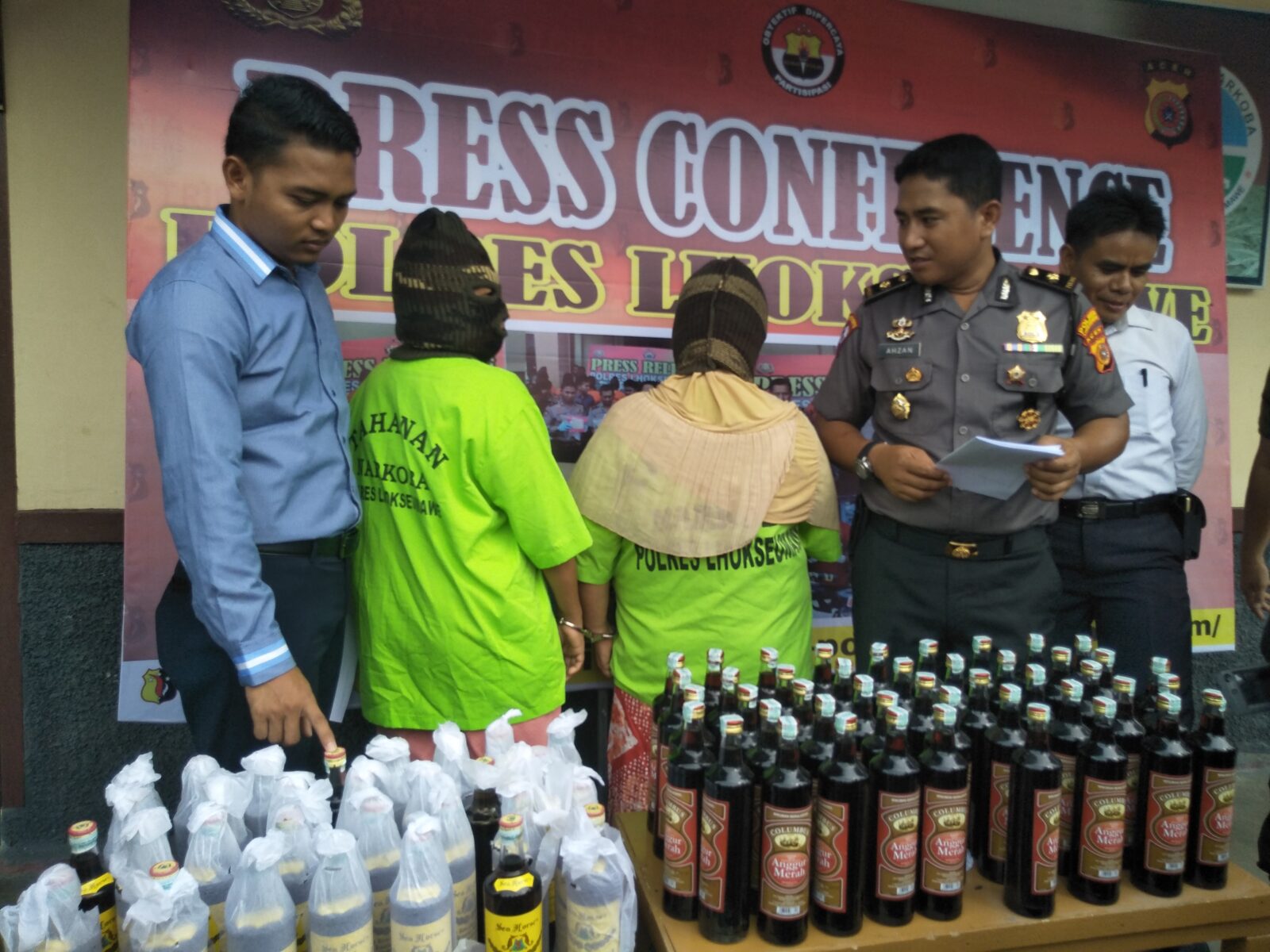 Kepada awak media Kapolres Lhokseumawe AKBP Ari Lasta Irawan, S.Ik melalui Kabag Ops, Kompol Azhan, S.Ik, SH, MSM saat konfrensi pers, Senin (30/4/2018) sore menyebutkan penangkapan kedua tersangka merupakan hasil operasi gabungan dengan anggota Polisi Militer. “Ada 76 botol miras kita sita. 45 botol merk Colombus mengandung alkohol 20 persen dan 31 botol merek Sea Horse,” imbuh Kompol Ahzan didampingi Kasat Narkoba Iptu Zeska Julian Wijaya.