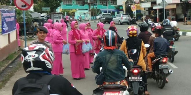 Istri-istri polisi dengan berseragam khas Bhayangkari warna pink tersebut turun ke jalan. Tampak Ketua Cabang Bhayangkari Polres Lhokseumawe Ny. Riny Lasta Irawan bersama sejumlah pengurus Bhayangkari bersemangat membagikan takjil kepada para pengguna jalan yang melintas di simpang jam Kota Lhokseumawe.