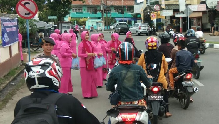 Istri-istri polisi dengan berseragam khas Bhayangkari warna pink tersebut turun ke jalan. Tampak Ketua Cabang Bhayangkari Polres Lhokseumawe Ny. Riny Lasta Irawan bersama sejumlah pengurus Bhayangkari bersemangat membagikan takjil kepada para pengguna jalan yang melintas di simpang jam Kota Lhokseumawe.