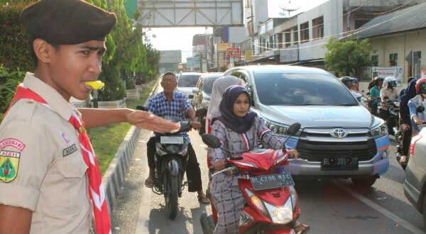 Tribrata News, Lhokseumawe-Pramuka Saka Bhayangkara binaan Polres Lhokseumawe ikut membantu kelancaran arus jelang berbuka puasa di Kota Lhokseumawe.