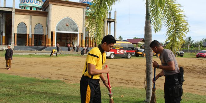 Tribrata News, Lhokseumawe- Personil Polri di jajaran Polres Lhokseumae membenahi Lingkungan Masjid As-Syura di Desa Meunasah Mee Kecamatan Muara Dua Kota Lhokseumawe, Selasa pagi (27/06/2018).