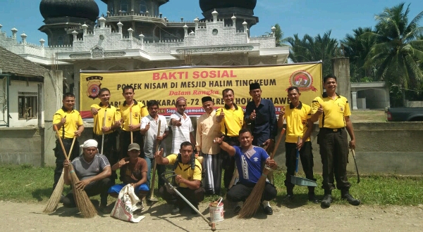 Tribrata News, Lhokseumawe- Kapolsek Nisam Ipda Amir Husin pimpin langsung bakti sosial (baksos) dengan gotong royong di Mesjid Halim Desa Tingkeum Kecamatan Nisam Kab Aceh Utara.”kamis (28/06/2018) pagi