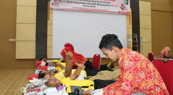 Tribrata News, Lhokseumawe- Gedung serba guna nampak dipenuhi oleh petugas berseragam putih dan kuning, selain itu, beberapa anggota dari satuan TNI setempat juga terlihat sedang mengantre dan lainnya terbaring di tempat tidur lipat dengan selang yang terpasang di lengan, Jumat (29/6/2018).