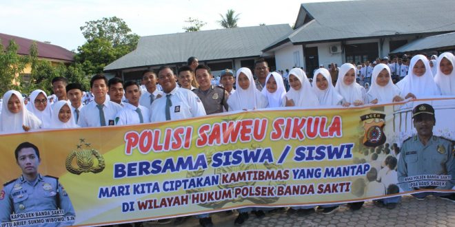 Tribratanews, Lhokseumawe- Kapolsek Banda Sakti Iptu Arif Sukmo Wibowo mewakili Kapolres Lhokseumawe berkunjung ke Sekolah Menengah Kejuruan (SMK) Negeri 1 setempat, Senin pagi 23 Juli 2018 dalam rangka kegiatan “Polisi Saweu Sikula”.