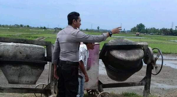 Bhabinkamtibmas Polsek Muara Batu Polres Lhokseumawe pantai pengerjaan pembangunan jalan rabat beton persawahan di gampong meunasah lhok Kecamatan Muara Batu Kabupaten Aceh Utara.” Minggu (19/08/2018) siang