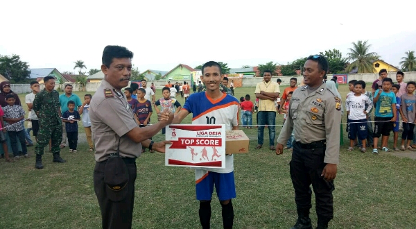 Tribrata News, Lhokseumawe- Kapolsek Muara Batu Iptu Bukhori Gam Cut menyerahkan hadiah kepada Top score turnamen bola kaki antar Desa Se-Kecamatan Muara Batu Kabupaten Aceh Utara.” rabu (29/08/2018) sore