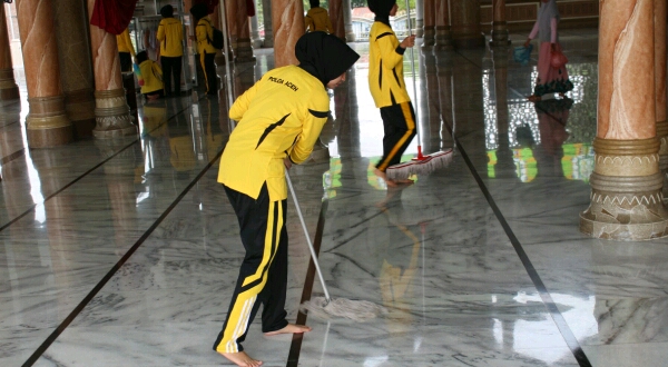 Tampak sejumlah Polwan dengan alat seadanya membersihkan lantai mesjid, memotong rumput serta merapikan tempat mukena. Hal itu dilakukan dalam rangka HUT Polwan ke 70 tahun 2018.