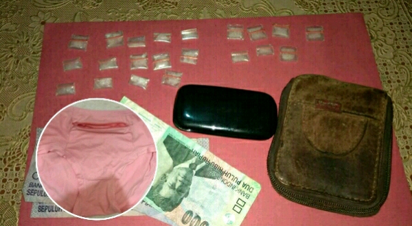 Sebanyak 14 paket sabu ditemukan di dalam kamar disimpan di celana dalam, sedangkan 7 paket sabu disimpan di dalam dompet warna coklat yang ditemukan di luar rumah.