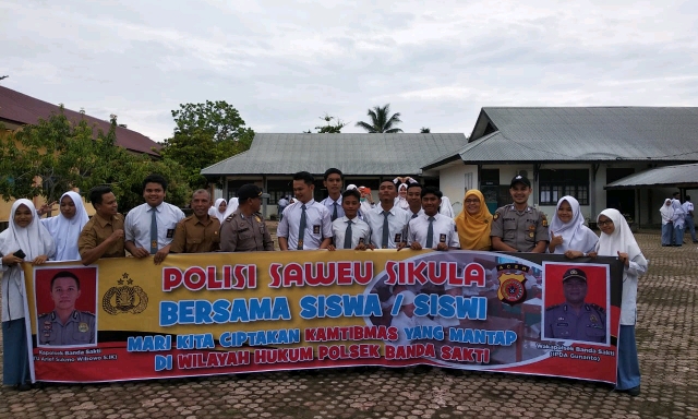 Tribrata News,Lhokseumawe- Kepolisian Resor Lhokseumawe Sektor Banda Sakti (Polsek Banda Sakti) melaksanakan program saweu sikula di SMK Negeri 1 Lhokseumawe, Senin (28/01/2019) pagi.