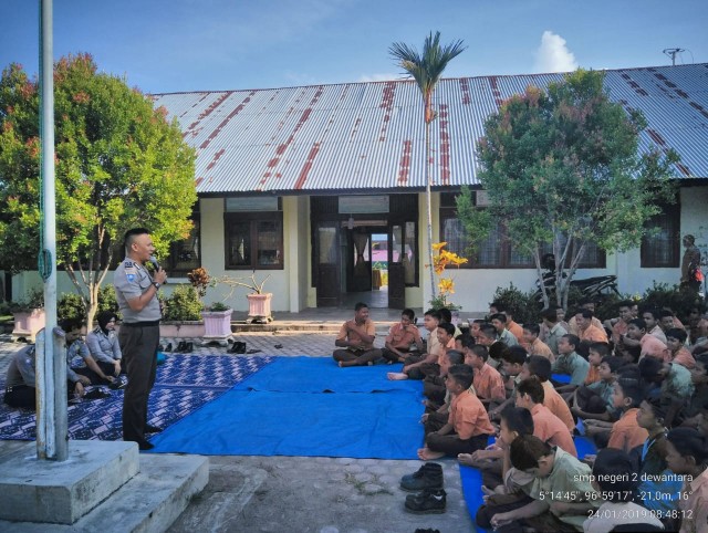Hadir dalam acara tersebut KBO Sat Binmas Polres Lhokseumawe Ipda Supianto, kanit Bintibmas Ipda Nina Ervianti , kanit Binkamsa Aipda Wildana dan Kaurmintu Bripk CTa Bu Hen bhdra serta diikuti 228 pelajar serta 36 guru SMP Negeri 2 Dewantara Kab. Aceh Utara.