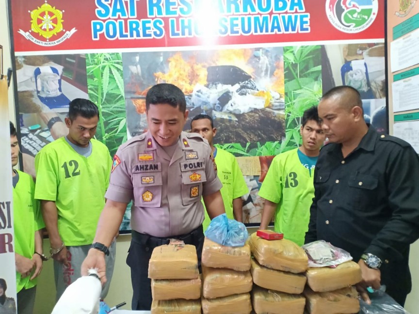 Kapolres Lhokseumawe AKBP Ari Lasta Irawan S,IK melalui Kabag Ops Kompol Ahzan, mengatakan, dari penangkapan para tersangka tersebut turut diamankan barang bukti berupa sabu seberat 49,28 gram, dan ganja 16,2 Kg dalam 10 kasus.