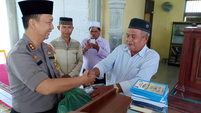 Tampak Kapolres Lhokseumawe yang didampingi Kasat Binmas Iptu H. Sarimin, SH, Kasubag Humas Penata I Salman Alfarasi serta Staf Polres Lhokseumawe menyerahkan bantuan sejumlah Mimbar, sajadah, Alquran dan surat Yasin.