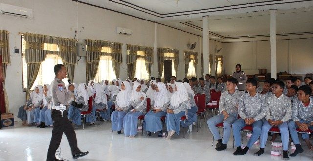 Tampak puluhan pelajar sangat antusias mendengarkan himbauan kamseltibcarlantas terkait tertib berlalu lintas tersebut.