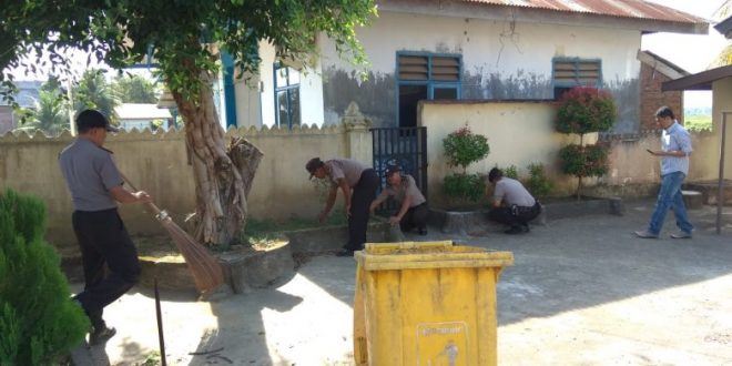 Dengan peralatan seadanya seperti sapu lidi, anggota Polsek membersihkan halaman sekitar kantor.
