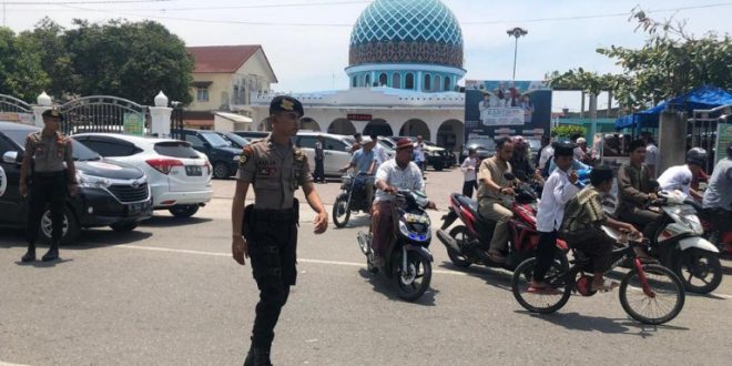 Tribrata News, Lhokseumawe – Sejumlah Polisi dari Tim URC Satuan Sabhara Polres Lhokseumawe memberikan pelayanan pengamanan dan pengaturan lalu lintas memasuki dan sesudah pelaksanaan sholat Jum’at di Mesjid Jamik Kec. Banda Sakti, Kota Lhokseumawe.” Jum’at siang (29/03/2019)