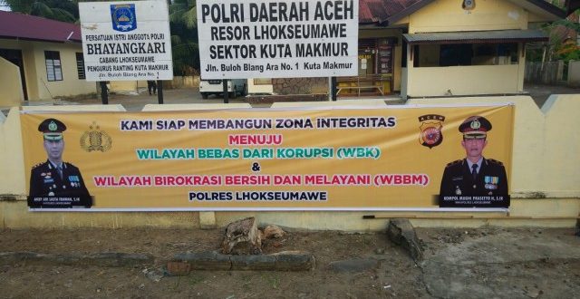 Tampak, sebagai bukti keseriusan dalam mewujudkan Polres Lhokseumawe menuju WBK dan WBB, Polres Lhokseumawe memasang spanduk sosialisasi zona integritas bebas korupsi dan birokrasi bersih melayani di tempat pelayanan, baik itu di SPKT sebagai gerbang pengaduan masyarakat, Ruang Pelyanan SIM, Kantor SAMSAT serta ruang pelayanan SKCK serta di Polsek jajaran Polres Lhokseumawe.