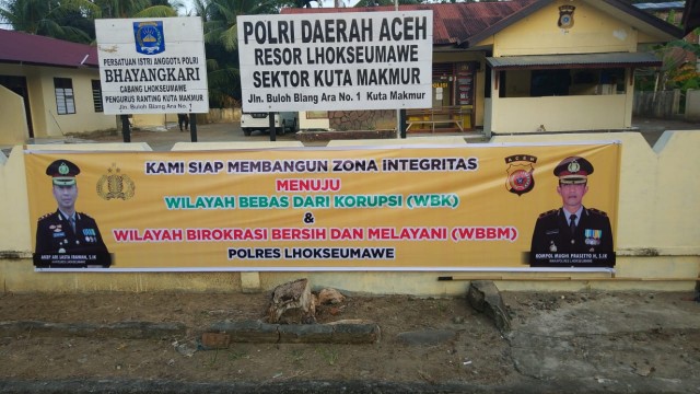 Tampak, sebagai bukti keseriusan dalam mewujudkan Polres Lhokseumawe menuju WBK dan WBB, Polres Lhokseumawe memasang spanduk sosialisasi zona integritas bebas korupsi dan birokrasi bersih melayani di tempat pelayanan, baik itu di SPKT sebagai gerbang pengaduan masyarakat, Ruang Pelyanan SIM, Kantor SAMSAT serta ruang pelayanan SKCK serta di Polsek jajaran Polres Lhokseumawe.