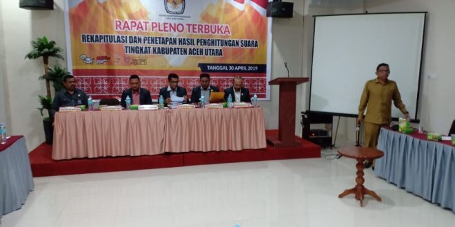 Tribrata News,Lhokseumawe – Komisi Independen Pemilu ( KIP ) Aceh utara menggelar rapat pleno terbuka rekapitulasi perolehan suara Pemilu 2019 di Aula Hotel Diana, Kecamatan Banda Sakti, Kota Lhokseumawe, Selasa (30/4/2019).