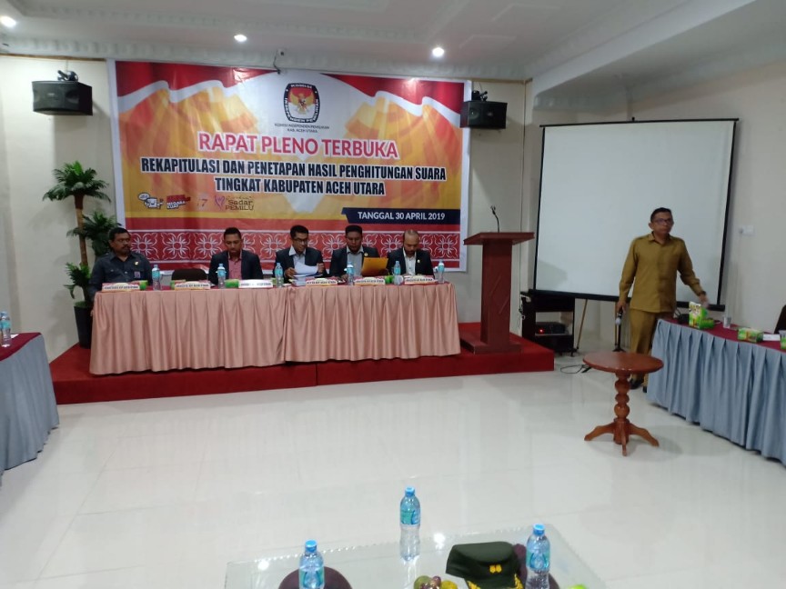 Tribrata News,Lhokseumawe – Komisi Independen Pemilu ( KIP ) Aceh utara menggelar rapat pleno terbuka rekapitulasi perolehan suara Pemilu 2019 di Aula Hotel Diana, Kecamatan Banda Sakti, Kota Lhokseumawe, Selasa (30/4/2019).