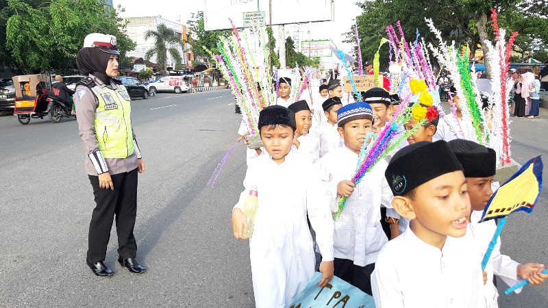 Tampak puluhan personil Polres Lhokseumawe mengawal dan mengamankan ribuan santri yang melakukan pawai keliling dari islamic centre menuju tugu simpang jaem dan kembali lagi menuju Islamic centre.