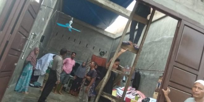 Kapolsek Simpang Kramat Iptu Azis pantaunrumah warga yang terdampak angin kencang di desa Keude sp IV kec sp kramat, Aceh utara yang mengakibatkan atap seng rumah warga berterbangan dan sejumlah gubuk roboh, senin (10/06/2019) sekitar pukul 17.00 Wib