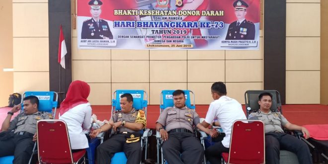 Tribrata News, Lhokseumawe– Dalam rangka menyambut Hut Bhayangkara ke 73, Polres Lhokseumawe gelar kegiatan donor darah yang berlangsung di gedung serba guna Polres Lhokseumawe, Selasa (25/6/2019).