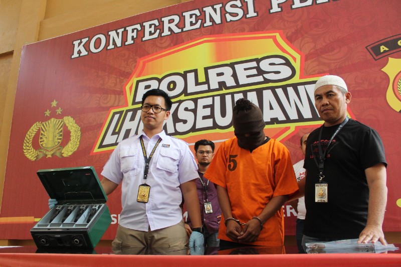 “Dari hasil penyelidikan, akhirnya kita menyimpulkan kalau pelaku pencurian mengerucut kepada tersangka AS. Hal ini terungkap setelah melihat fakta dan olah TKP kejadian serta keterangan sejumlah saksi. Tersangka sempat melarikan diri ke daerah Langkat Sumatra Utara hingga akhirnya pelariannya terhenti dan berhasil ditangkap di kawasan Kota Langsa, dimana sebelumnya tersangka berkeinginan kembali ke Lhokseumawe,” Jelas AKP Indra kepada wartawan dalam konferensi pers, Minggu (30/6/2019) di Mapolres Lhokseumawe.
