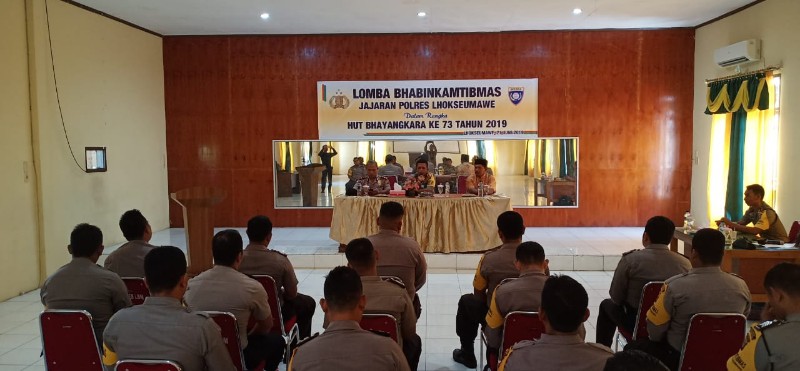 Tribrata News,Lhokseumawe – Dalam rangka Memperhatikan Bhyangkara ke 73, Polres Lhokseumawe menggelar lomba Bhabinkamtibmas jajaran Polres Lhokseumawe yang berlangsung di Aula Bhayangkara Mapolres Lhokseumawe, Jum’at (21/06/2019).