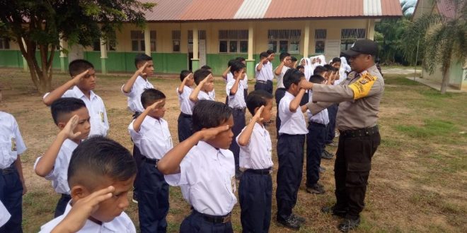 Bhabinkamtibmas Polsek Simpang kramat mengajarkan latihan praturan baris berbaris (PBB) kepada murid SMP Negeri 1 Syamtalira Bayu, Kabupaten Aceh Utara, Selasa (16/07/2019).