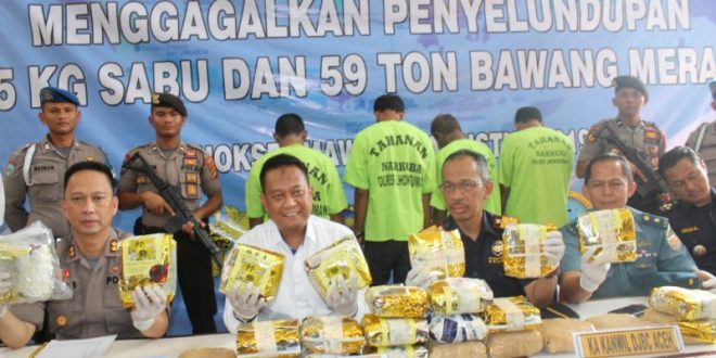 Tribrata News, Lhokseumawe – Polres Lhokseumawe bersama biaya cukai setempat gelar konferensi pers terkait pengungkapan kasus Narkoba jenis sabu sebanyak 25 kilogram serta 59 ton bawang merah ilegal yang ditangkap oleh Tim patroli Bea Cukai di kawasan perairan Tanah Jambo Aye, Aceh Utara.