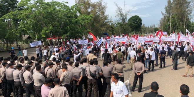 Tribrata News,Lhokseumawe – Polres Lhokseumawe mengerahkan ratusan personil mengawal aksi unjuk rasa massa yang tergabung dalam Ikatan Keluarga Blang Lancang (IKBAL) Kota Lhokseumawe di depan Pintu bekas PT Arun LNG, Senin (26/08/2019).