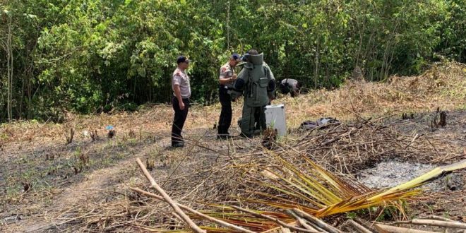 Tribrata News, LHOKSEUMAWE- Tim Unit Jibom Brimob Kompi B Jeulikat untuk mengamankan satu buah granat nenas yang ditemukan oleh warga di sebuah kebun kawasan Gampong Ulee Geudong Kecamatan Sawang Kabupaten Aceh Utara, Senin (16/9/2019) sekira pukul 12.00 WIB.