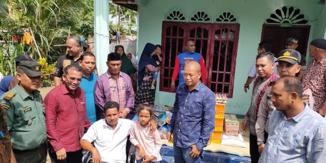 Tampak Walikota Lhokseumawe Tgk Suaidi Yahya bersama Ketua DPRK Lhokseumawe Ismail A manaf menyerahkan bantuan sosial tersebut kepada korban kebakaran an. Basri berupa satu unit kursi roda dan sejumlah sembako.