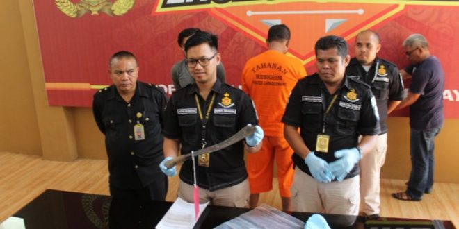 Akhirnya terjadi cekcok, dari cekcok tersebut akhirnya tersangka menyerang korban, setelah korban terjatuh tersangka mengambil parang yang tergantung di sepeda motor milik korban dan menghujamkan parangnya sebanyak 3 kali ke tengkuk bagian belakang, akhirnya korban sampai terluka berat dilarikan ke rumah sakit dan meninggal dalam perjalanan menuju rumah sakit” ujar AKP Indra didampingi Kbo Satreskrim IPDA Situmorang dan Kasubag Humas Salman Alfarasi.
