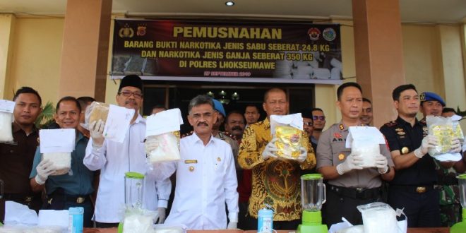 Tribrata News, Lhokseumawe – Polres Lhokseumawe menggelar pemusnahan barang bukti Narkotika Jenis sabu dan ganja hasil pengungkapan kasus dan penyerahan barang bukti hasil tangkapan bea cukai yang berlangsung di Mapolres Lhokseumawe, Jum’at ( 27/09/2019) pagi.
