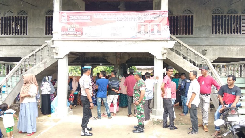 Tribrata News, Lhokseumawe – Personil Polsek Dewantara dan Bhabinsa setempat kawal pemilihan Geuchik Pulo Rungkom Kec. Dewantara Kab Aceh Utara Periode 2019 – 2025 yang berlangsung di Meunasah Pulo Rungkom, Kec. Dewantara Kab. Aceh Utara, Kamis (05/09/2019) pagi.