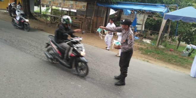 Tribrata News, Lhokseumawe – Kepolisian resor Lhokseumawe sektor Muara satu bersama Personil Koramil bersinergi dengan petugas Puskesmas setempat membagikan masker warga kepada pengendara di jalan Medan-B.Aceh, Senin (23/09/2019) sekira pukul 09.00 WIB.