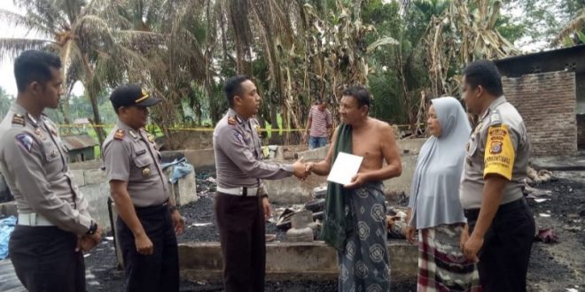 LHOKSEUMAWE- Kasat Lantas (Kaslan) Polres Lhpkseumawe serahkan bantuan dari Ditlantas Polda Aceh yang diberikan kepada korban kebakaran yang melalap satu unit rumah semi permanen milik warga masyarakat Desa Punti Kec. Syamtalira Bayu Kab. Aceh Utara, senin (27/01/2020).