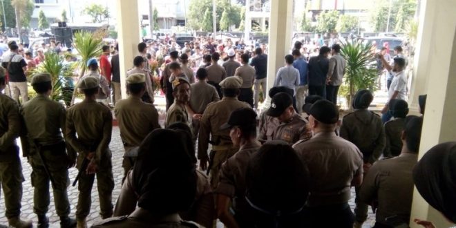 LHOKSEUMAWE-Polres Lhokseumawe mengerahkan ratusan personil dalam rangka pengamanan aksi damai oleh massa yang tergabung dalam Forum Komunikasi Geuchik dan Pemuda Kecamatan Muara Satu, menggelar aksi protes terhadap keberadaan Ikatan Keluarga Blang Lancang (IKBAL), di depan Kantor Walikota Lhokseumawe, Kamis (6/2/2020) pagi.