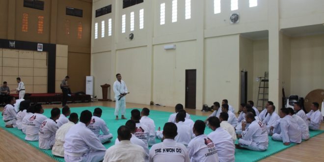 LHOKSEUMAWE- Puluhan personil Polres Lhokseumawe dilakukan tes kemampuan bela diri yang berlangsung digedung serba guna Wira Satya Polres Lhokseumawe, selasa (11/02/2020).
