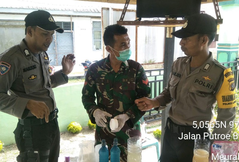 LHOKSEUMAWE- Bhabinkamtibas dan Bhabinsa melakukan sosialisasi terbatas terhadap sejumlah geuchik tentang tata cara pembuatan Disinfektan guna mencegah penyebaran Covid-19 dilingkungan masyarakat Meurah Mulia, kamis (26/03/2020).