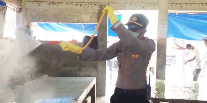 LHOKSEUMAWE- Kapolsek Blang Mangat-Muspika seprotkan desinfektan di Pasar Punteut guna percepatan pencegahan penyebaran covid-19 di wilkum kec. Blang Mangat Kota Lhokseumawe, senin (30/03/2020).