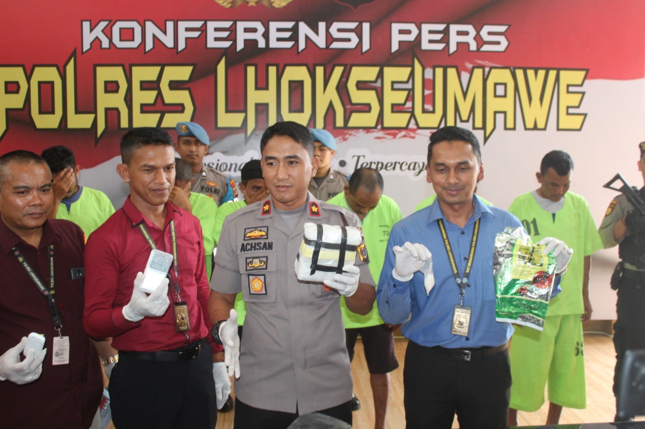 LHOKSEUMAWE – Polres Lhokseumawe berhasil ungkap kasus narkoba jaringan internasional Malaisia-Aceh serta berhasil menangkap enam tersangka dan sita 1 kg sabu yang dibungkus dengan kertas teh China.