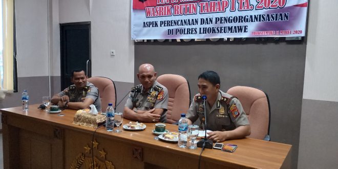 Kapolres Lhokseumawe AKBP Ari Lasta Irawan, S.Ik melalui Wakapolres Lhokseumawe Kompol Ahzan, S.Ik, SH, MSM dalam sambutannya mengucapkan selamat datang di Polres Lhokseumawe kepada Tim Itwasda Polda Aceh Tahap I TA. 2020 dalam rangka wasrik pada aspek perencanaan dan pengorganisasian di Polres Lhokseumawe.